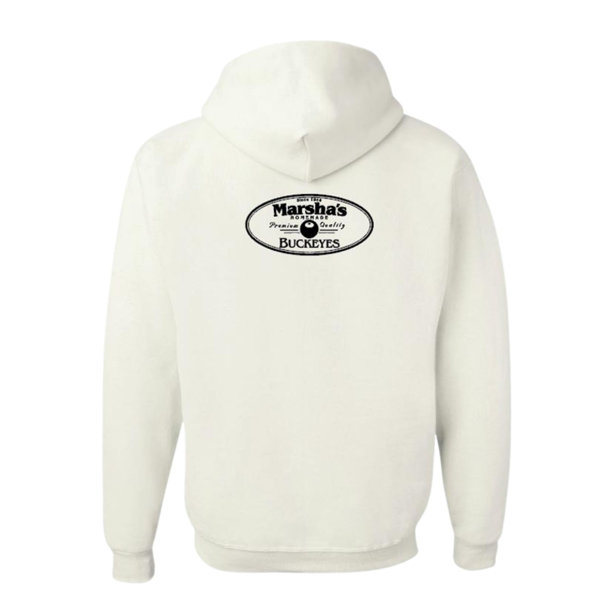 Stay cozy and show off your Buckeye homage with the Marsha’s Buckeyes Hooded Sweatshirt! Made from a soft and durable 50% cotton, 50% polyester blend, this hoodie offers the perfect balance of comfort and warmth. Designed to fit true to size, it’s ideal for game days, casual outings, or relaxing at home. Featuring a bold Buckeye design on the front and the iconic Marsha’s Buckeyes logo on the back, it’s a must-have for every buckeye lover out there.
